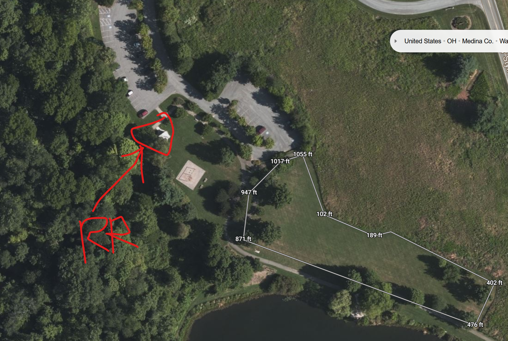 It would be roughly a 10 minute drive NW from the Wadsworth Eagles as an estimate. There is a nice, open, oblong field that has some nice trees that could be used for antennas. It's about 400ft long and about 75ft wide. I've attached a marked-up picture of the area below.